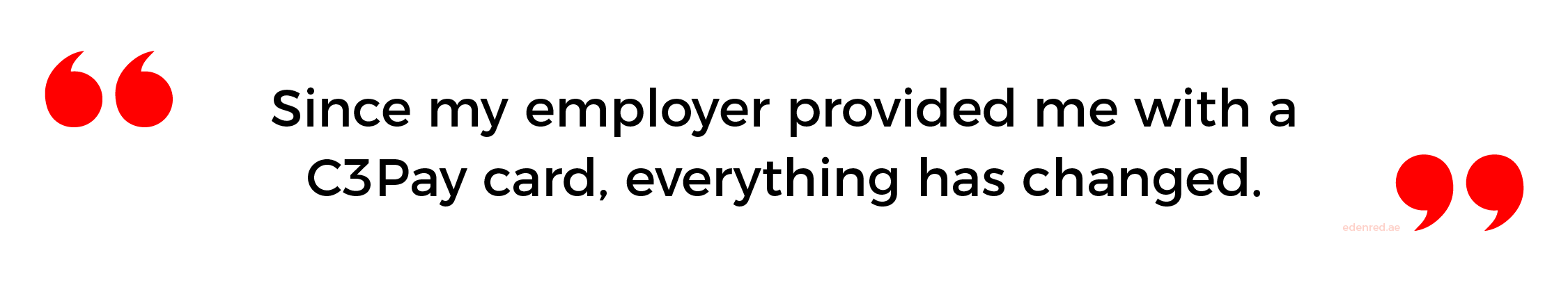 “Life in Dubai has been busy since I arrived 13 years ago. My work schedule doesn’t leave me much free time, so every moment counts. Before using C3Pay Edenred, I had to travel across the city on my only day off just to transfer money back home. Sometimes, if I was too busy, I had to rely on a friend to do it for me. The process was slow, inconvenient, and stressful.